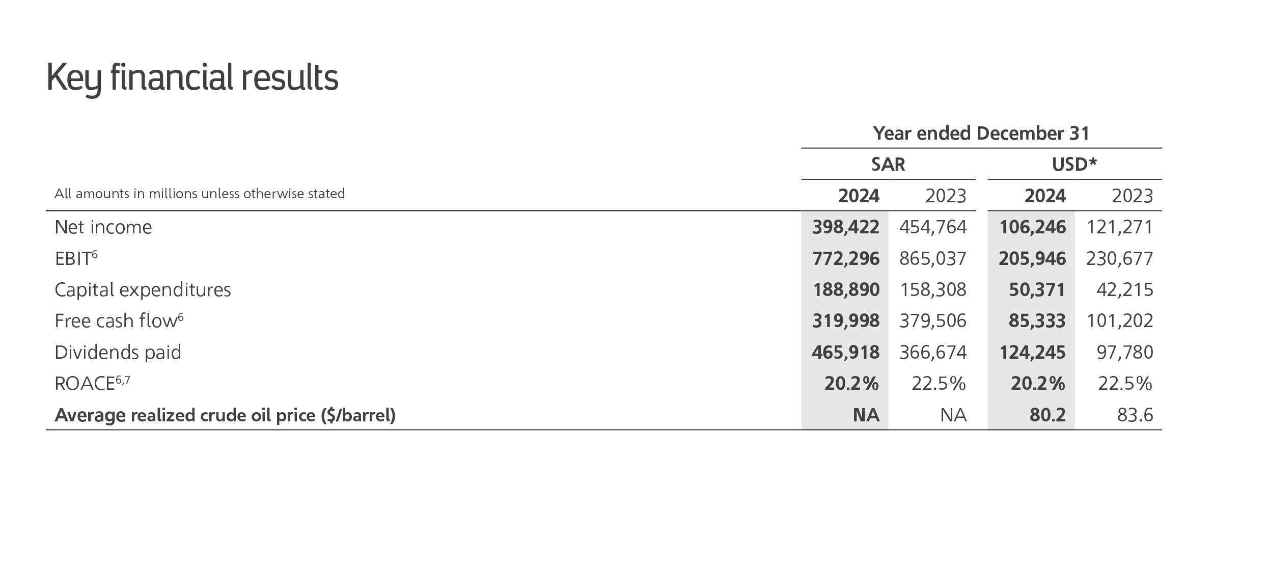 - Board declares base dividend of $21.1 billion for Q4, a 4.2% YoY increase, to be paid in Q1 2025, reflecting Aramco’s focus on delivering a sustainable and progressive dividend