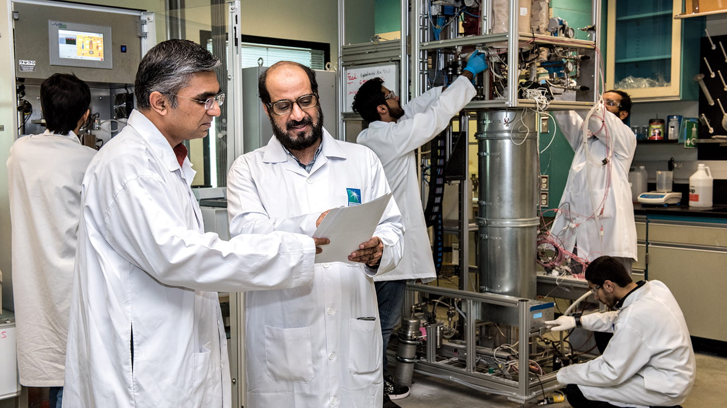 التعاون مكوّن أساس في برنامج تحويل النفط الخام إلى منتجات كيميائية، وفي هذه الصورة يبدو العالمان مساعد الغرامي (يمين) وقوبال جوتو وهما يناقشان بعض جزئيات البرنامج المهمة، في حين يبدو عدد من علماء المختبر وهم منهمكون في عملهم.