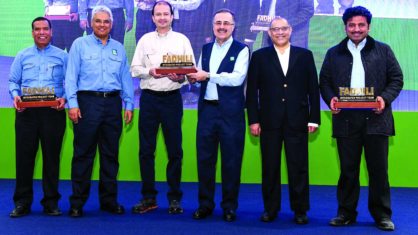 Aramco President and CEO Amin Nasser and other executives recognize Fadhili Gas Plants Projects manager Hisham U. Derhalli and other members of his team at a 2020 ceremony.