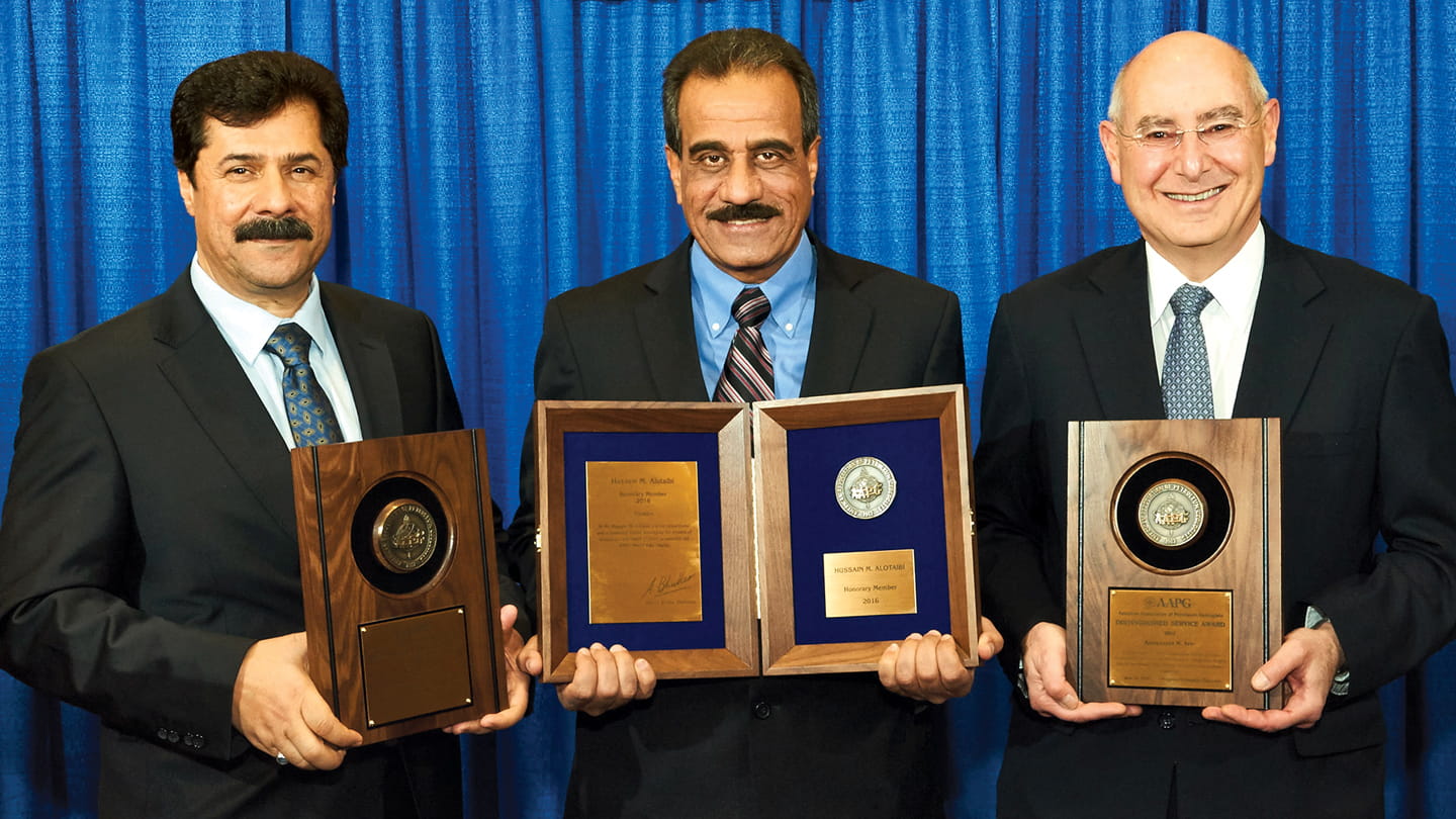 ففي هذا الموتمر السنوي، حصل مدير إدارة تقييم موارد التنقيب في أرامكو السعودية، الأستاذ حسين العتيبي، على جائزة العضوية الفخرية للجمعية، نظير ما بذله من جهودٍ وتفانٍ في خدمة عِلم ومهنة جيولوجيا البترول وكذلك الجمعية. وجاء في كلمة التكريم: "أن حسين العتيبي، عالم جيولوجيا فَذّ وقائد ملهم، سخَّر علمه الواسع وموهبته الفائقة لتأسيس الجمعية الأمريكية لجيولوجيي البترول، فرع منطقة الشرق الأوسط". وقد أسهم العتيبي في نجاح الجمعية الأمريكية لجيولوجيي البترول وغيرها من المنظمات المهنية التي تعمل في الشرق الأوسط منذ أكثر من 30 عامًا.