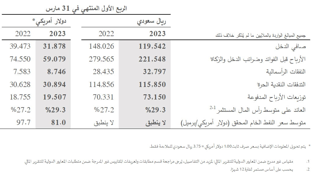 - صافي الدخل: 119.5 مليار ريال سعودي (31.9 مليار دولار أمريكي)، (الربع الأول 2022: 148.0 مليار ريال سعودي / 39.5 مليار دولار أمريكي)