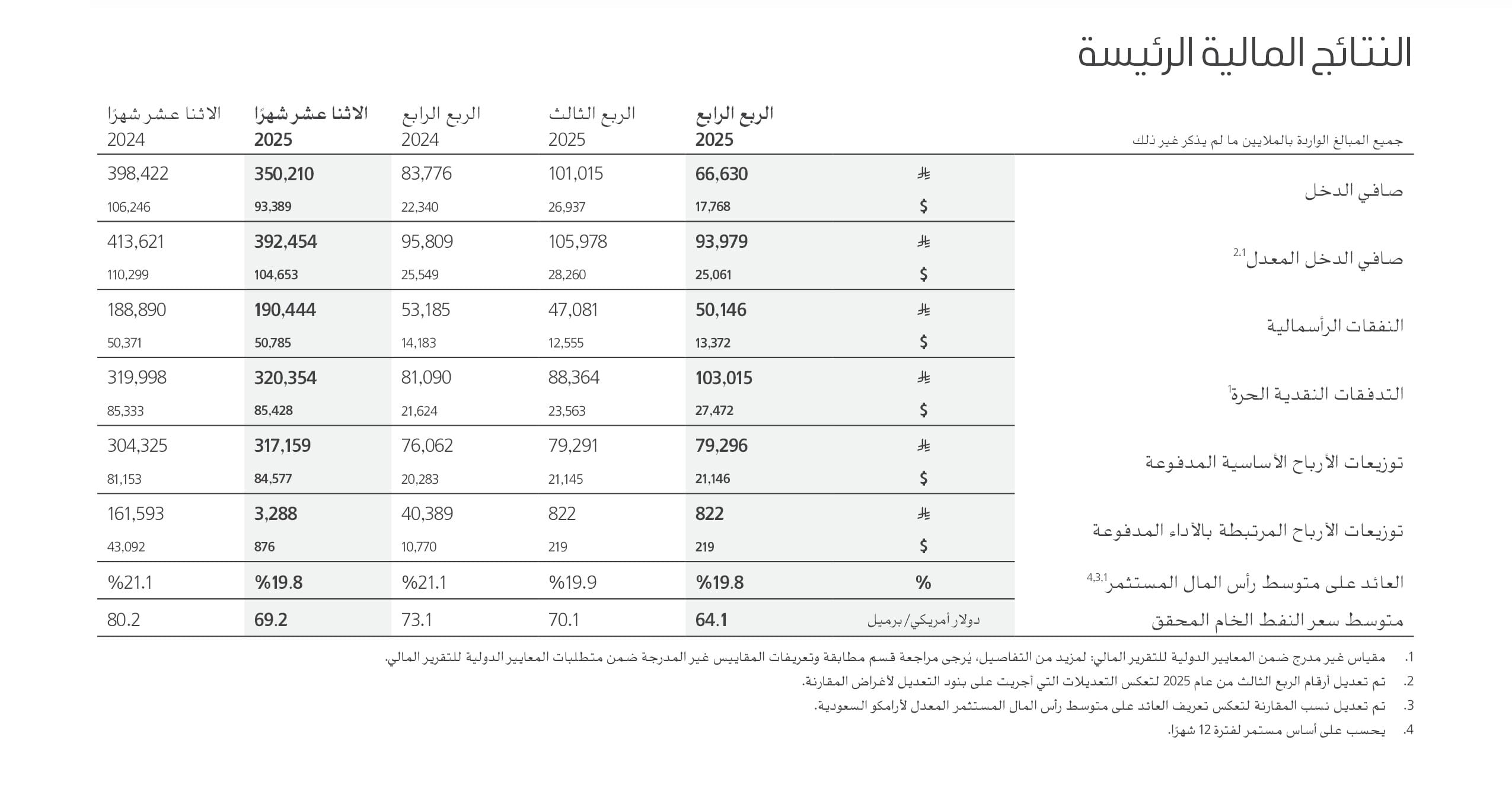 - صافي الدخل المعدل1: 392.5 مليار ريال سعودي (104.7 مليار دولار أمريكي) للسنة المالية 2025 /94.0 مليار ريال سعودي (25.1 مليار دولار أمريكي) للربع الرابع