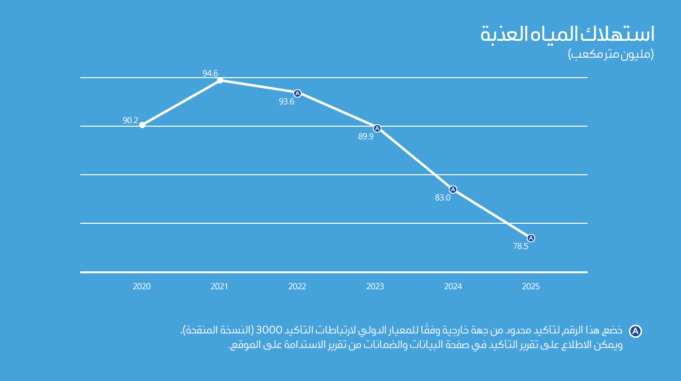 بفضل استثماراتها المستمرة وجهودها للمحافظة على المياه، بلغ استهلاك أرامكو (الشركات المنتسبة، والمملوكة بالكامل لأرامكو، والخاضعة لإدارتها التشغيلية) من المياه العذبة حتى نهاية عام 2025 ما يقرب من 78.5 مليون متر مكعب، مسجلاً انخفاضًا بنسبة 5.4% مقارنة بعام 2024 الذي بلغ فيه الاستهلاك (83.0 مليون متر مكعب).